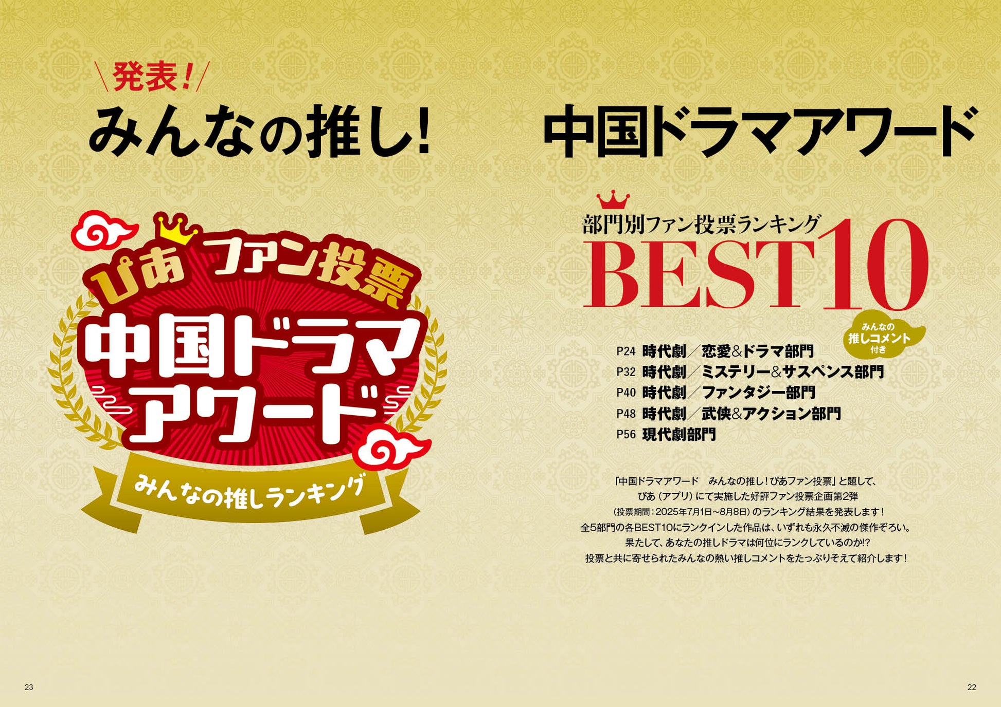 本誌では、ファンによる投票企画「中国ドラマアワード みんなの推し!ぴあファン投票」の最終結果を発表!投票の最終結果をもとに、中国ドラマの人気ランキングをファンからの熱い推しコメントと共にお披露目!「次はどの中国ドラマを見たらいいかな?」「みんなの本当の推し作品が気になる!」「新作情報も知りたい」にお応えする中国ドラマガイド誌の決定版です!