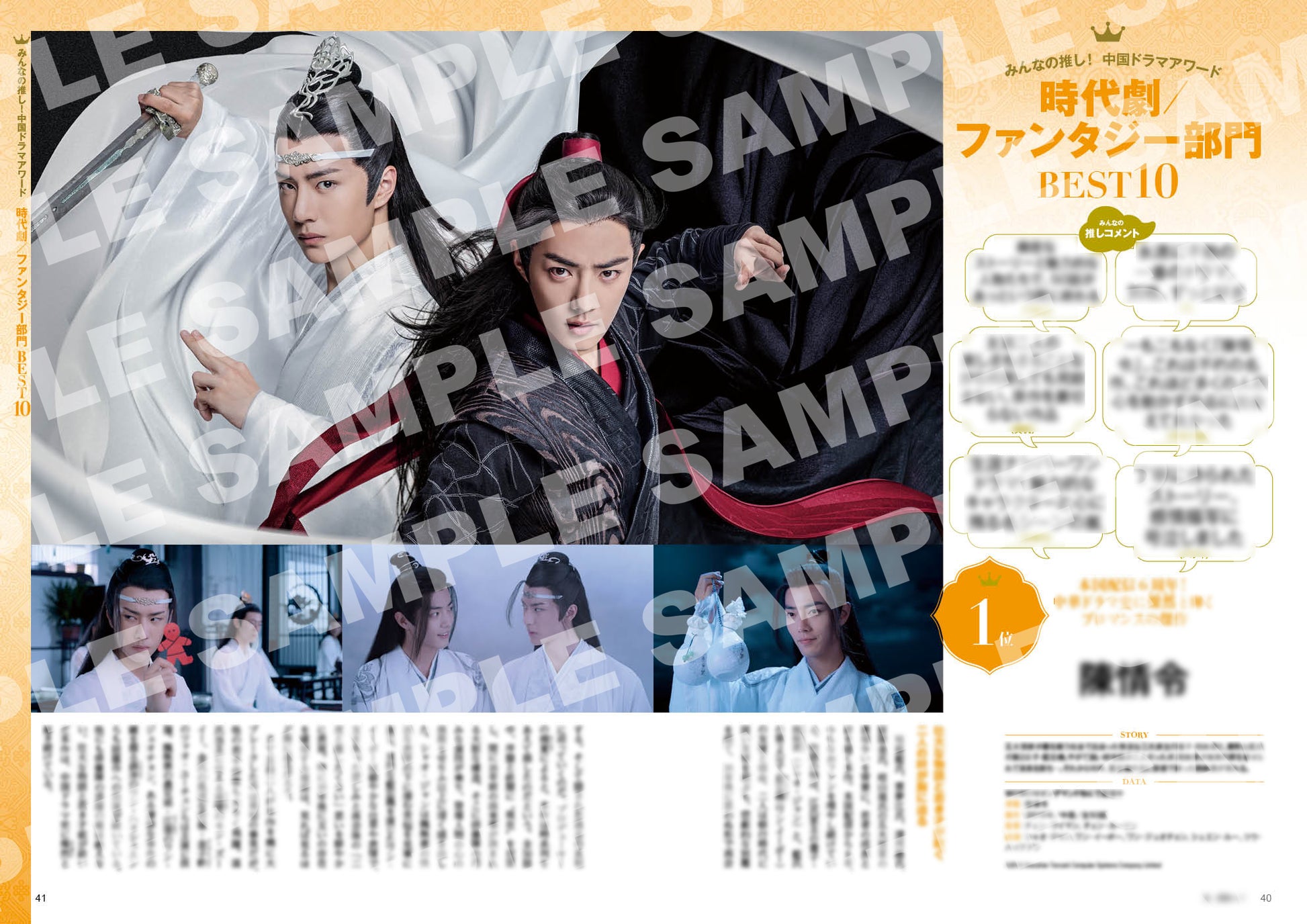 大注目の表紙を飾るのは、「陳情令」のシャオ・ジャン(肖戦)&ワン・イーボー(王一博)!さらに、同じく「陳情令」出演者であるユー・ビン(于斌)の撮りおろしショットがダブル表紙に登場します!